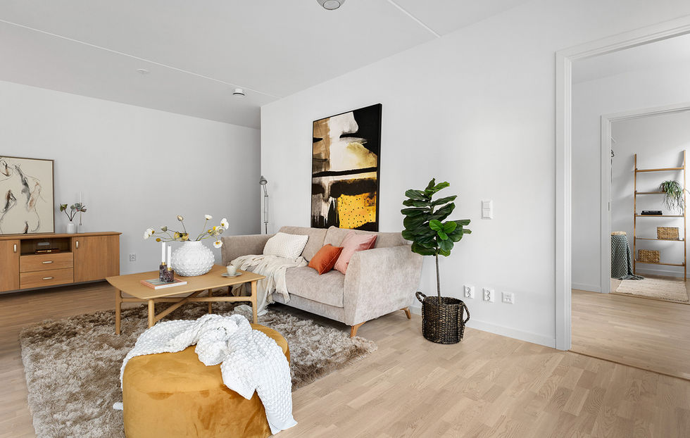 När du kliver in möts du av en mindre hall med städskåp och plats för klädhängare. Här finns också en möblerbar vägg som passar perfekt för vitrinskåp, sidobänk eller annan förvaring. Därefter finns ett ljust och öppet kök och vardagsrum i en smart planlösning. Denna yta har gott om plats för både en rejäl matgrupp för det stora sällskapet och soffgrupp för mysiga hemmakvällar. De stora fönsterpartierna mot sydväst släpper in rikligt med dagsljus och skapar en inbjudande och ljus känsla.